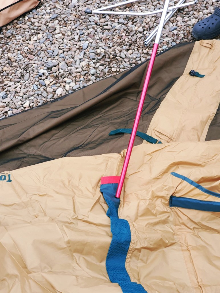 콜맨 스크린 타프의 폴대는 총 3개로 두 개는 녹색으로 X자로 교차되는 형태이고 붉은색은 중간에 들어가는 폴대로 각각의 폴대가 들어가야 하는 스크린 타프 윗면에 친절하게 색상이 표시되어 있었습니다.