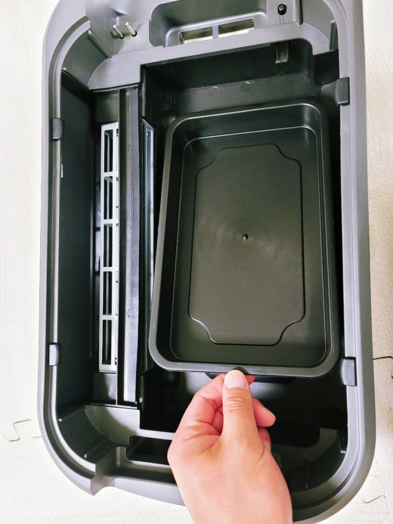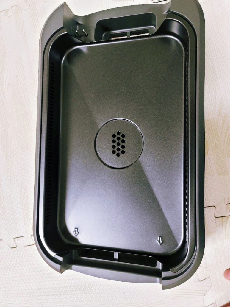사용하기 전 연기를 잡아주기 위해 물을 팬 내에 넣어주어야 하는데 그릴 팬의 경우 불판 자체에 밑으로 내려갈 수 있는 구멍이 있기 때문에 어느 위치든 종이컵 반 컵의 물을 넣어주면 됩니다.