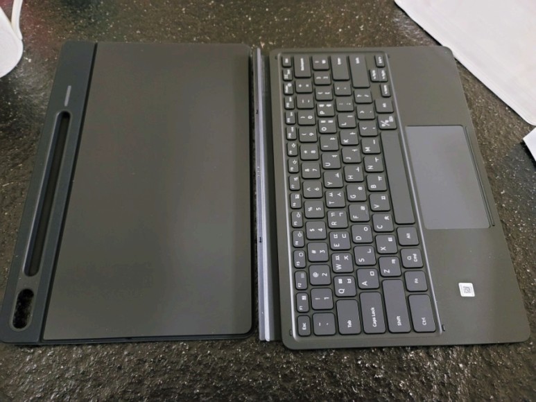 갤럭시 탭 S7+의 크기가 12.4인치이다 보니 정품 키보드도 왠만한 넷북 정도 수준의 크기를 자랑했고 실제로 노트북 자판에 대어 보아도 작지 않은 크기를 자랑하는 모습이었습니다.