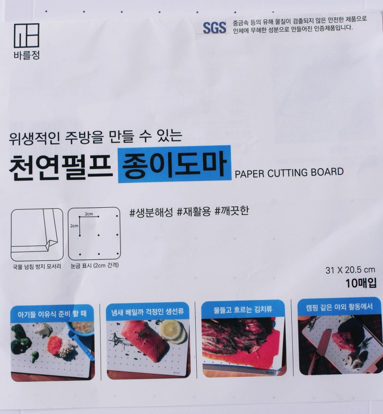 리뷰할 제품은 천연펄프를 이용한 종이 도마로 물들거나 흐르는 음식류 혹은 냄새 밸까 걱정인 음식류에 있어서 일회용이기에 걱정 없이 사용할 수 있다는 장점이 있습니다.