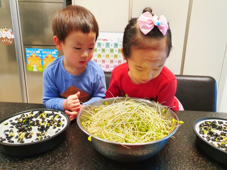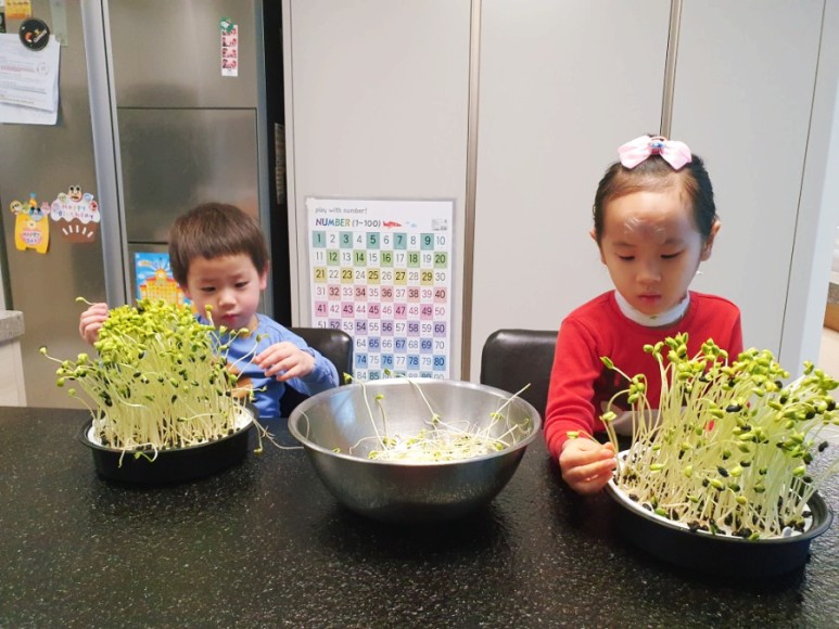 지난번 느타리버섯 키우기 과정을 통해 아이들이 식물을 키우는 재배의 재미와 함께 다 자란 식물을 수확해 음식을 해 먹는 기쁨까지 느낀 경험이 있다 보니 이번 콩나물 키트에 더욱더 큰 관심과 애정을 보이는 모습이었습니다.
