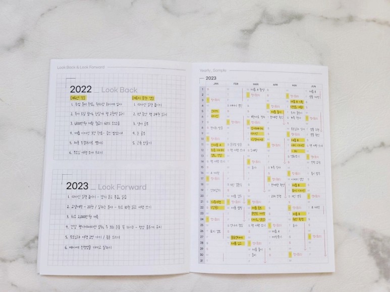 오로다 다이어리의 작성예시를 보면서 그동안 한 해의 큰 계획에만 집중하고 세부 계획에는 꼼꼼하지 못했던 단점을 보안해 줄 것 같아 2023년은 정말 제대로 한 번 다이어리를 활용해 봐야겠다는 생각이 들었습니다.