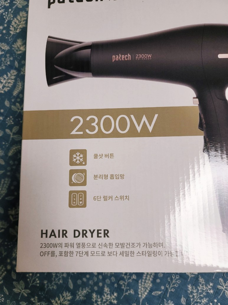 광고 등을 통해서 구매할 때부터 지속적으로 강조해서인지 뇌리에 강하게 남았던 성능의 장점 중에 하나가 바로 2300W의 초코출력의 강한 바람으로 빠른 건조가 가능하다는 장점이 눈에 띄였습니다.