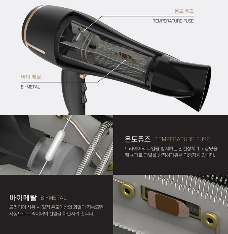 저렴한 가격이지만 내부의 드라이기의 과열을 방지하기 위한 온도퓨즈나 바이메탈이 들어가 있어 이상 온도가 감지되면 전원을 차단하므로 안전성 측면에서도 장점이 있었습니다.